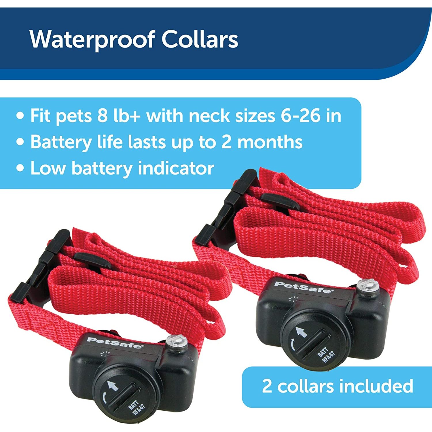 The PetSafe Basic In-Ground Fence allows you to create a secure 1/3 acre wire boundary around your yard to give your pet freedom to explore. This fence allows you to expand your best friend's play area by 5 acres with the purchase of additional wire and training flags. This In-Ground Fence kit comes with 2 UltraLight Receiver Collars. The waterproof collars feature a tone-only mode for training, plus 4 levels of adjustable correction depending on your dog's temperament. The receiver collars have a low-battery indicator that will let you know when it is time to replace the battery. The collars adjust to fit neck sizes between 6-26 inches and are recommended for pets who weigh 8 pounds and up. With the purchase of additional PetSafe In-Ground Fence receiver collars, the PetSafe Basic In-Ground Fence will contain an unlimited number of pets with a single system.